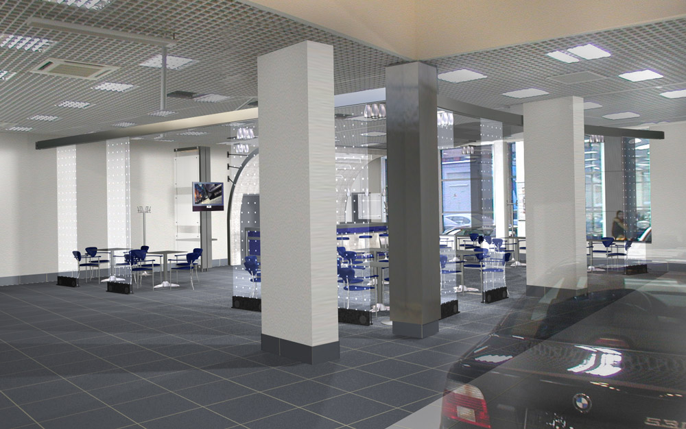 Cafe in the corporate style of BMW. Кафе в корпоративной стилистике БМВ. Совместно с арх. Т. Чистовой, АБ "Шаболовка". ArchiCad & 3D Max.