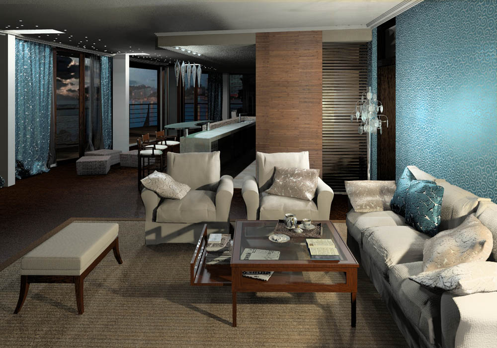 Interior visualization of hotel suite.