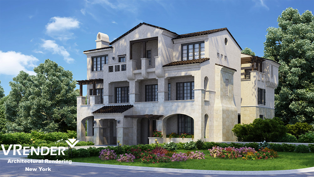 Exterior rendering of apartment building.