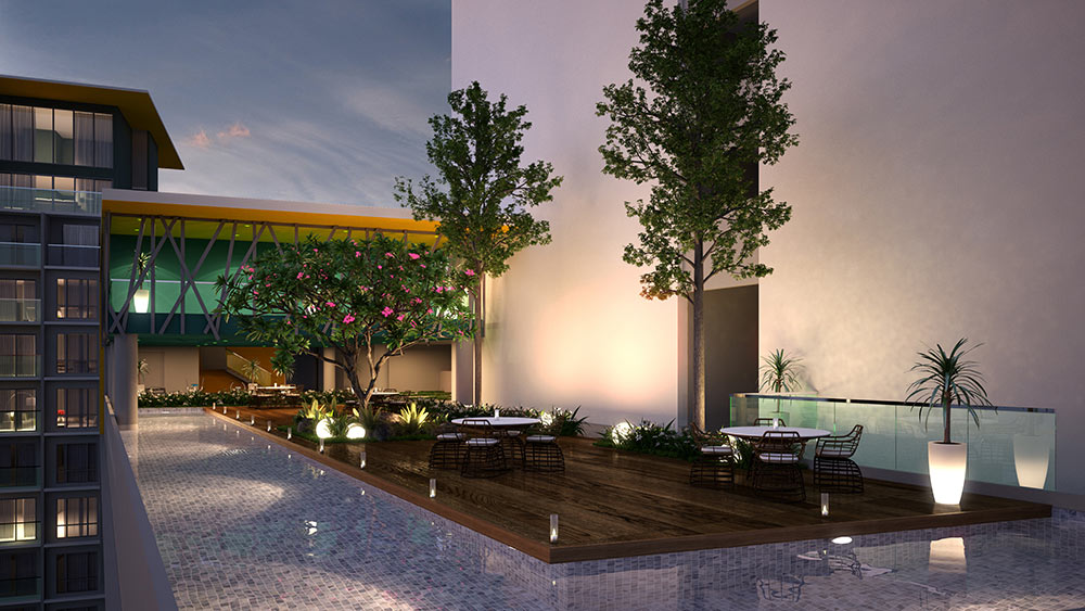 The Nest apartment complex, a swimming pool.