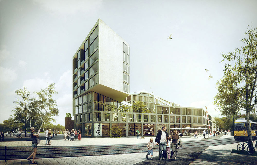 Exterior visualization of a mixed-use complex.