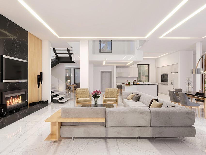 Grey and black used for kitchen counter, staircase, window frames, and furniture enhance the contrast while few touches of light wood color in furniture legs, and TV wall adds warmth to space as you see in the architectural rendering outputs.