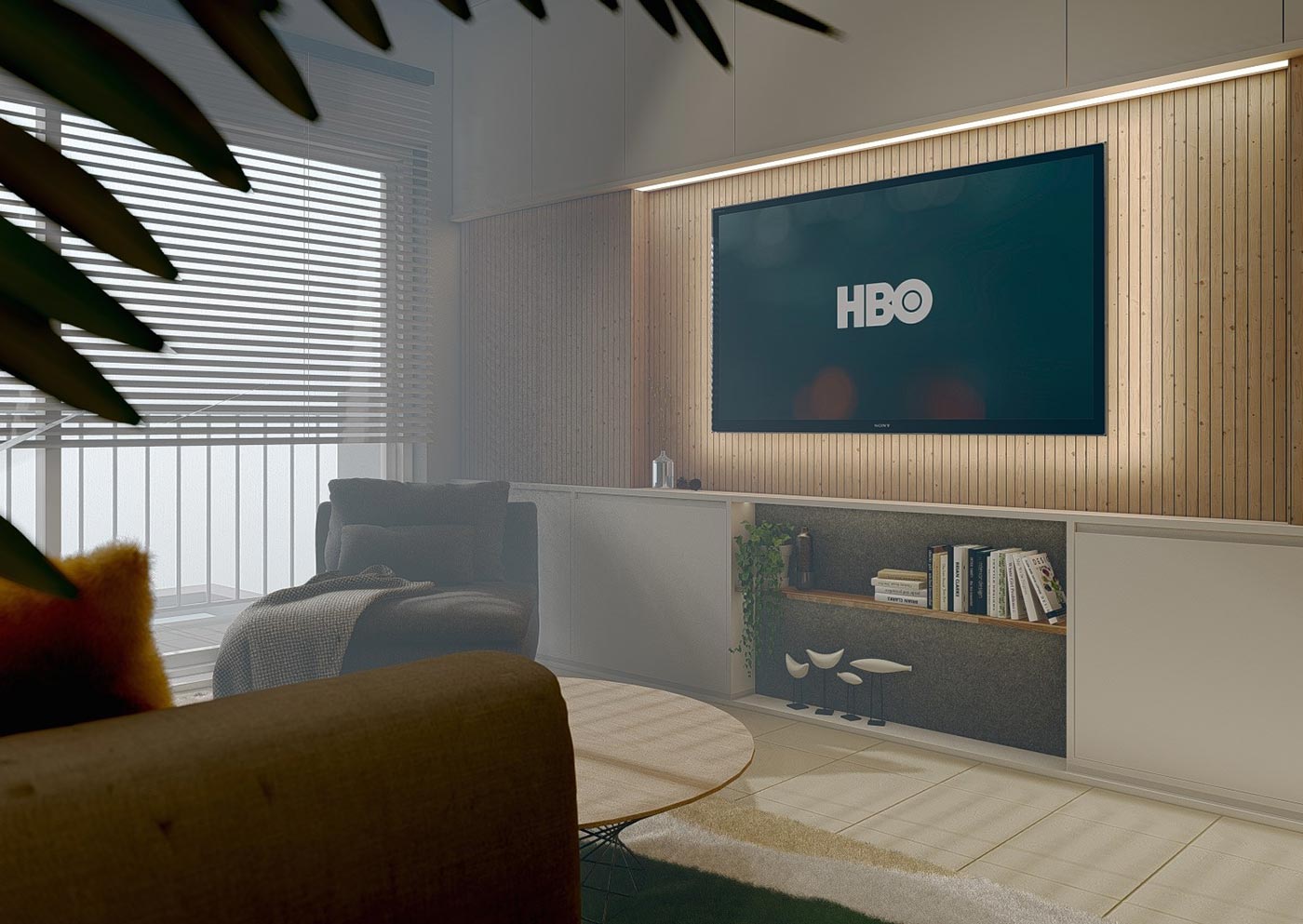 The furniture is fully customized to fit the existing space as can be seen in the TV area or in the upper drawers in the main room.