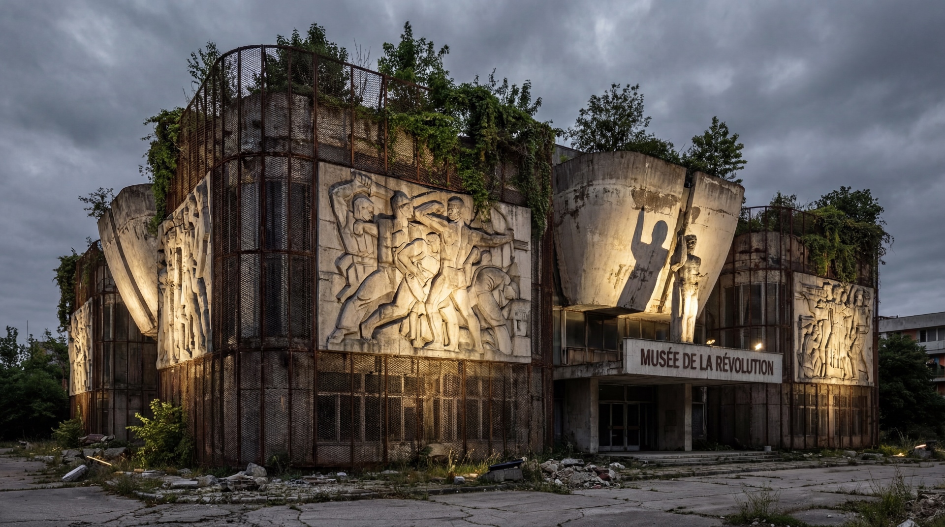 A dystopian museum of revolution: brutalist curves wrapped in oxidized steel mesh, abstract relief murals depicting ideological struggle, and Le Corbusier-style roof gardens now overgrown — dramatic spotlights carve heroic shadows across decaying yet majestic concrete forms.