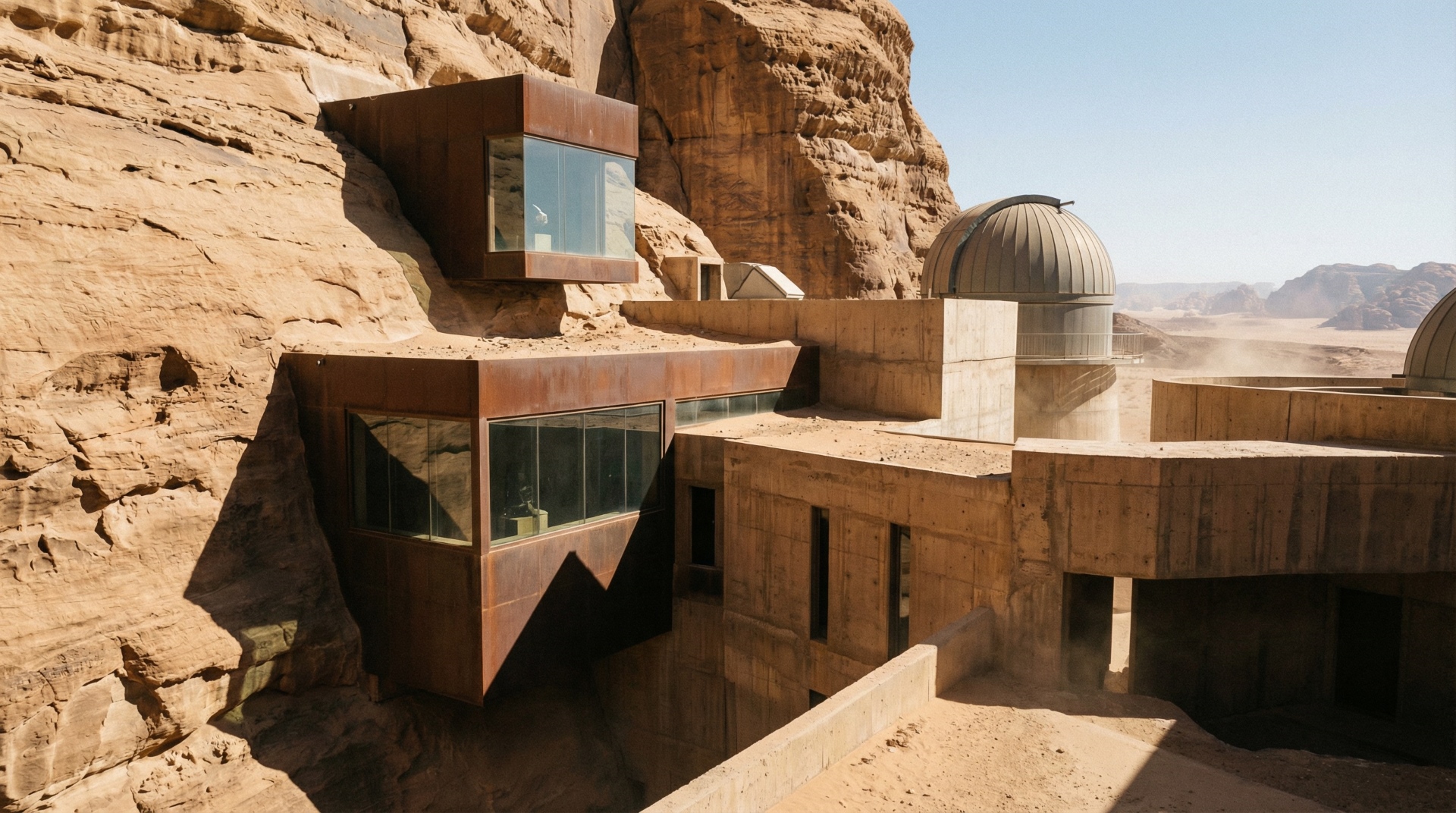 Architecture prompt: Ultra-realistic photo of a desert observatory built into a sandstone cliff: concrete and weathered steel structure with precision-cut glass apertures, dust accumulation on surfaces, harsh midday sun casting razor-sharp shadows, visible heat haze, DSLR Canon EOS R5, f/8, 35mm.