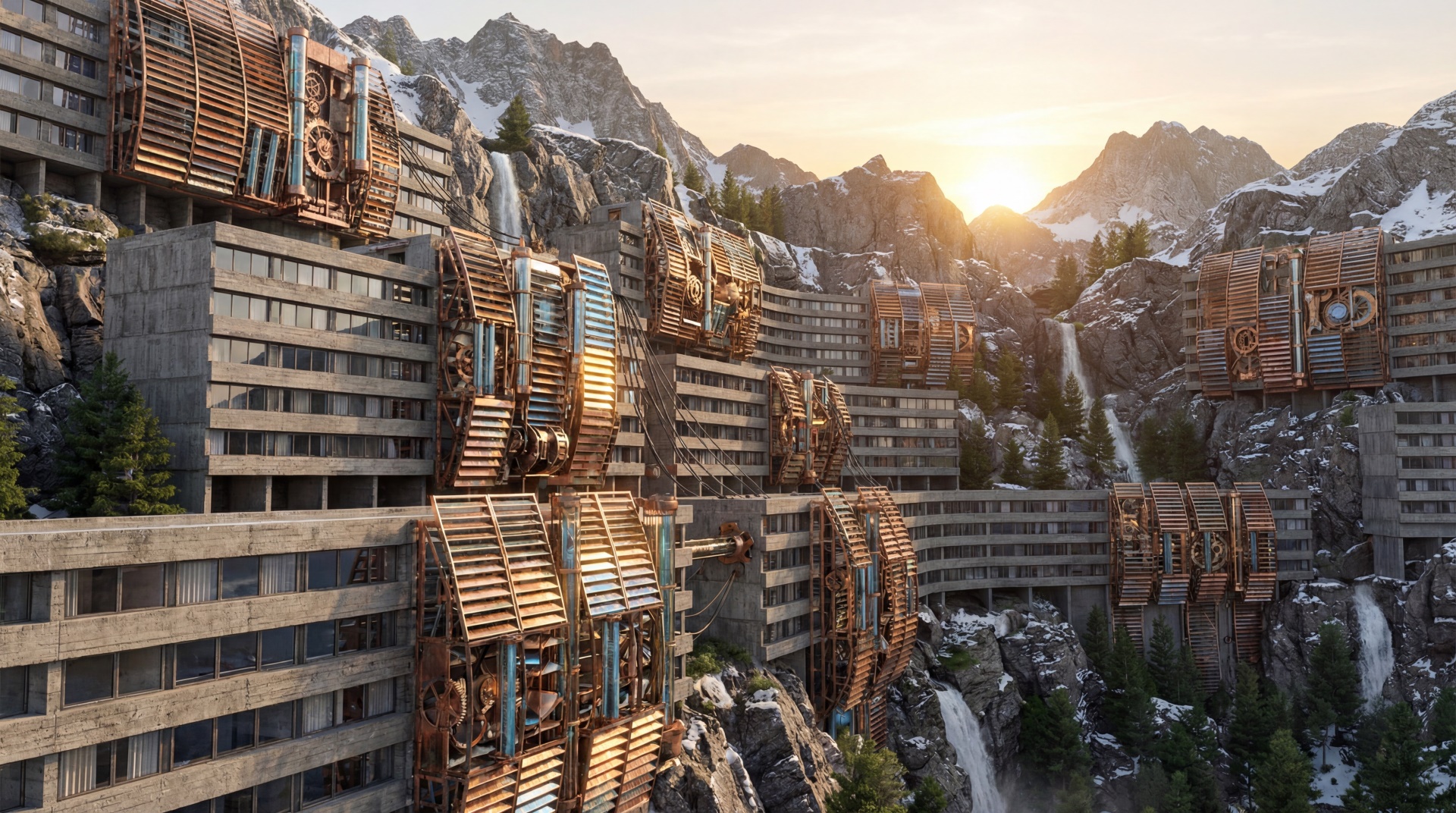 Architecture prompt: A mountain-embedded architectural complex: terraced Corbusian apartments with ribbon windows cascade down cliffs, fused with Chernikhov’s kinetic façades of moving copper louvers and glass tubes that glint in alpine sunlight, merging nature, machine, and human scale.