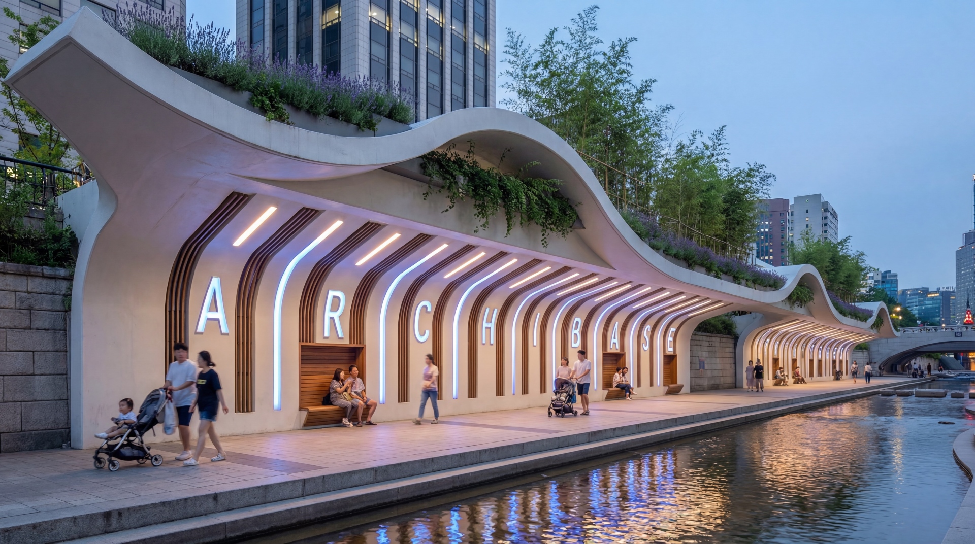 Architecture prompt: Modern embankment with a decorative canopy with the inscription ARCHIBASE and people walking