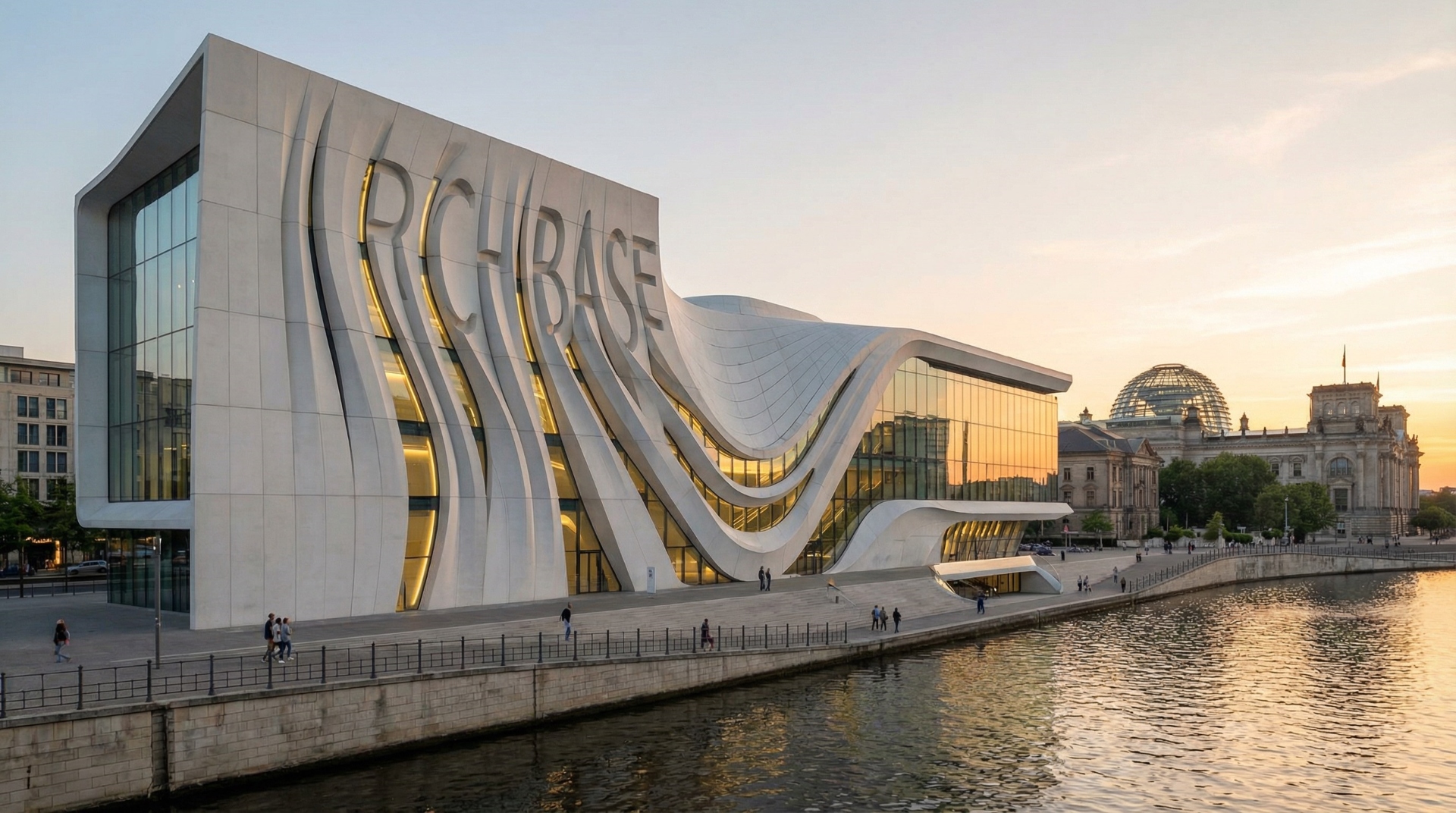 Architecture prompt: The building of the ARCHIBASE planet museum on the embankment in the city center with a central facade in the bionic style