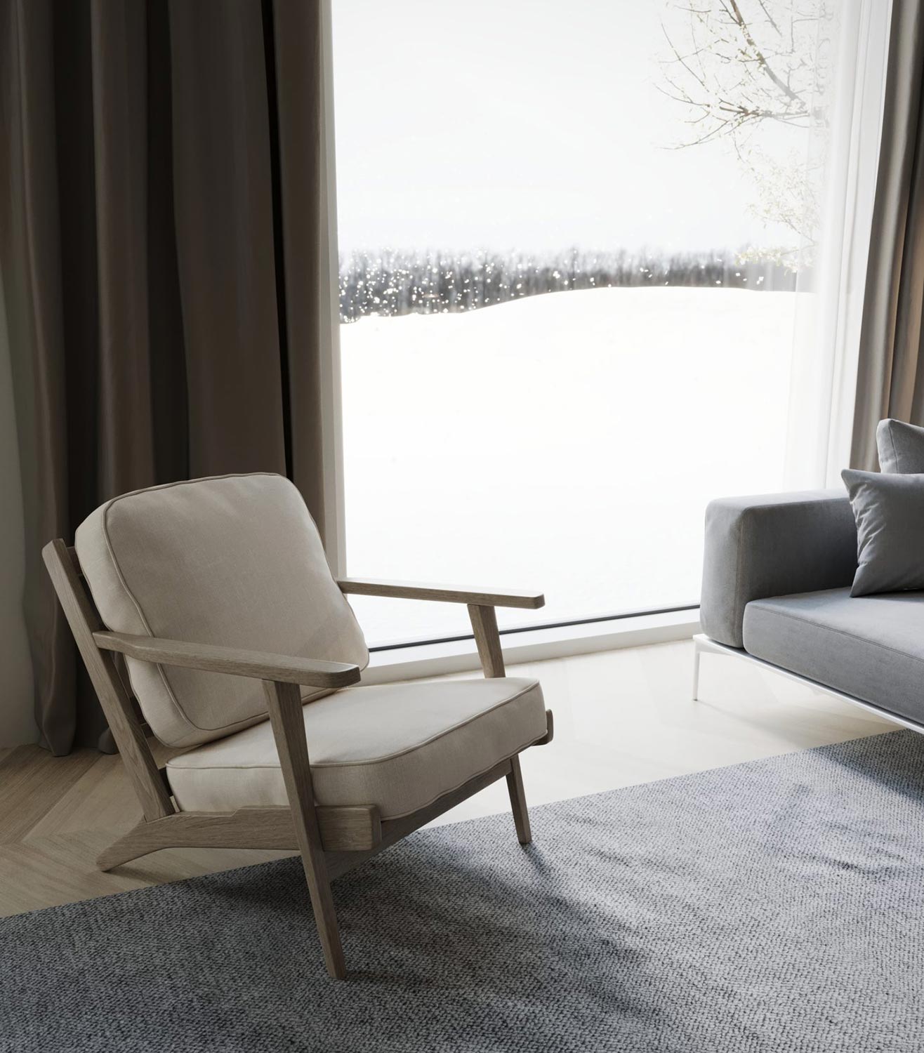 The FrostFrame Living room features meticulously designed elements such as a cozy couch, a sleek coffee table, and an armchair all set against the backdrop of a captivating snowfall framed by a large window. The lighting and textures breathe life into the space, and the animated elements like the smoke rising from a coffee cup and flickering candle flames provide a touch of comforting warmth against the serene winter setting outside.