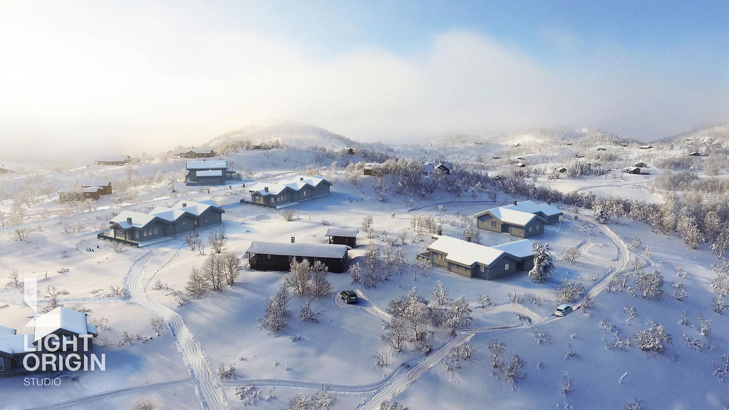 Aerial rendering of residental area in frozen north.