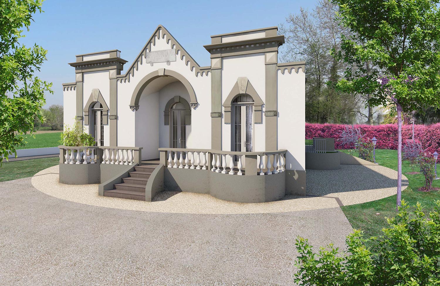Progetto di una villa bifamiliare all'interno del quartiere residenziale ParmaMia. Render a dettaglio fotorealistico degli esterni.