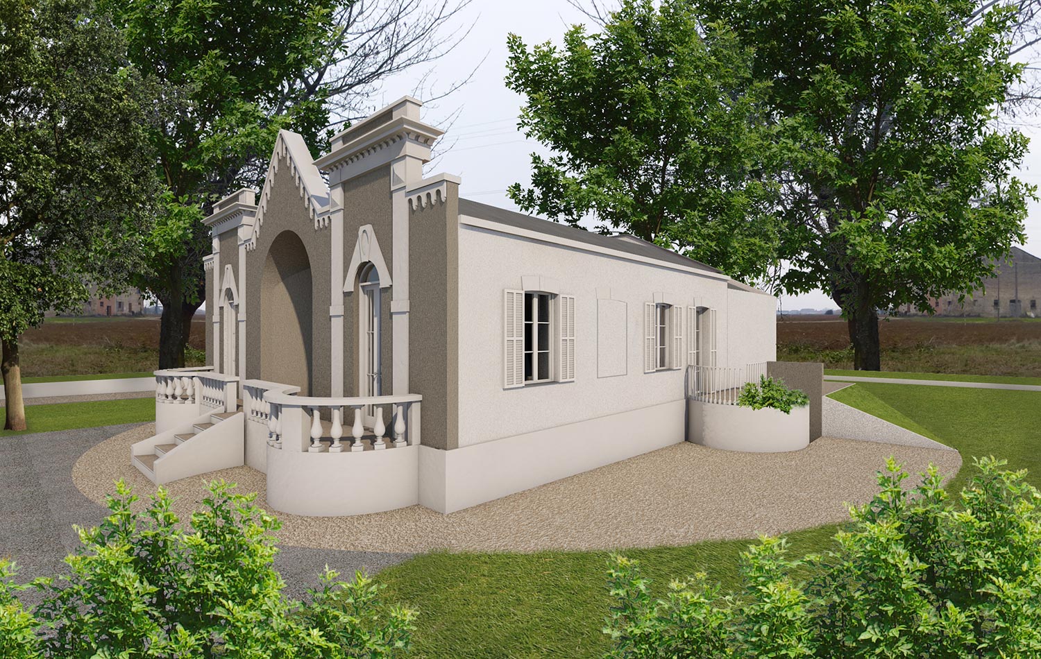 Progetto di una villa bifamiliare all'interno del quartiere residenziale ParmaMia. Render a dettaglio fotorealistico degli esterni.