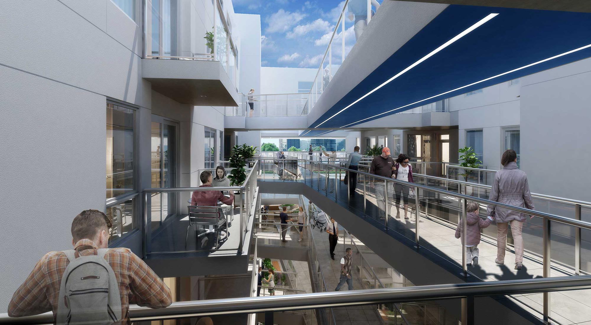 We incorporated a completely unique interpretation of the city’s planning and zoning code which calls for building massing step-backs that offer no benefit to tenants. We calculated that a step-back results in 212,000 cubic feet of negative space at the front of the building. The design transfers a portion of this volume to create a ground floor plaza for outdoor dining, and a larger opening mid-level in the residential portion of the building façade, which we call the Portal.